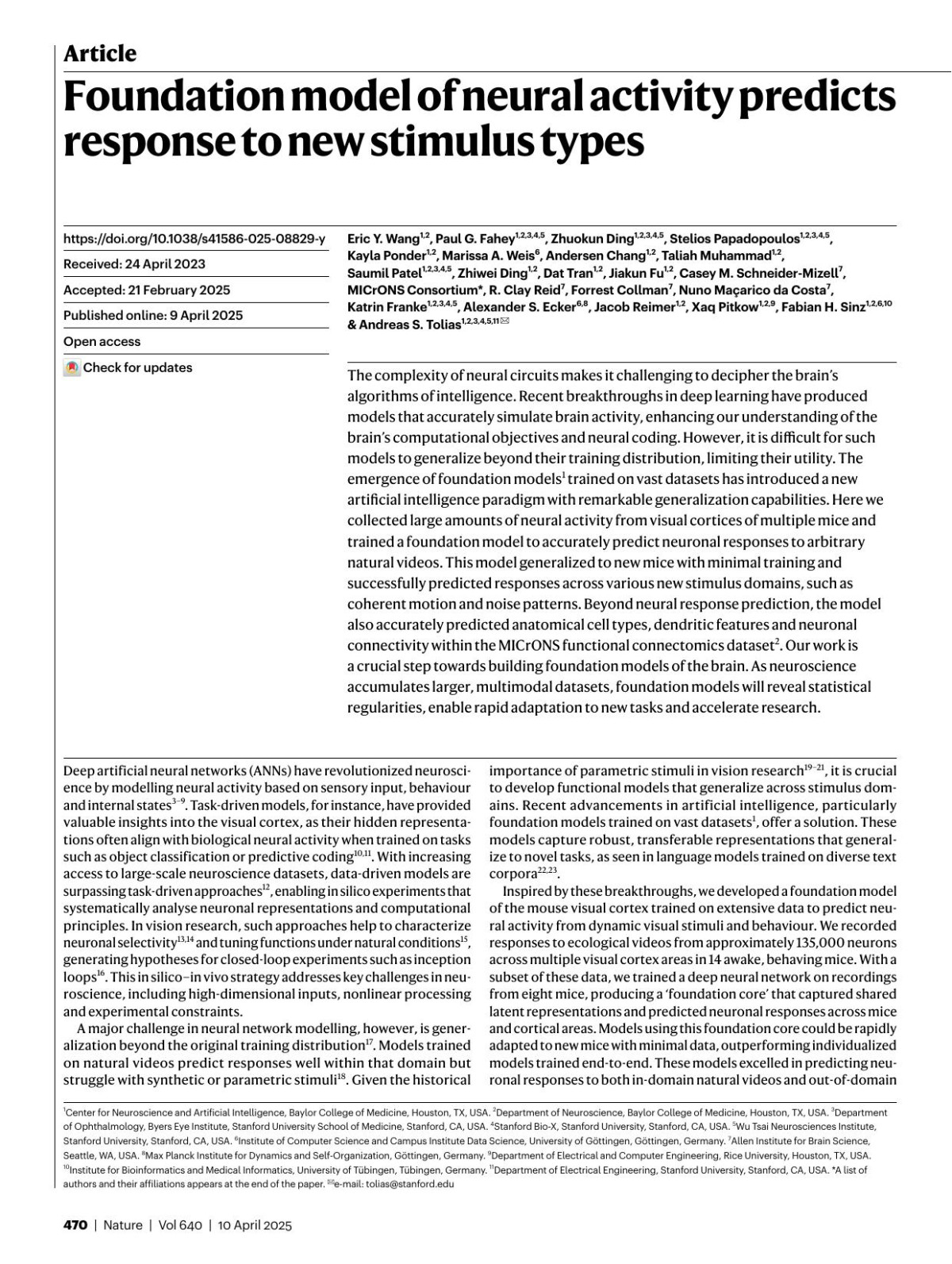 8 reviewsUnderstanding the relationship between circuit connectivity and function is crucial for uncovering how the brain computes. In mouse primary visual cortex, excitatory neurons with similar response properties are more likely to be synaptically connected1–8; however, broader connectivity rules remain unknown. Here we leverage the millimetre-scale MICrONS dataset to analyse synaptic connectivity and functional properties of neurons across cortical layers and areas. Our results reveal that neurons with similar response properties are preferentially connected within and across layers and areas—including feedback connections—supporting the universality of ‘like-tolike’ connectivity across the visual hierarchy. Using a validated digital twin model, we separated neuronal tuning into feature (what neurons respond to) and spatial (receptive feld location) components. We found that only the feature component predicts fne-scale synaptic connections beyond what could be explained by the proximity of axons and dendrites. We also discovered a higher-order rule whereby postsynaptic neuron cohorts downstream of presynaptic cells show greater functional similarity than predicted by a pairwise like-to-like rule. Recurrent neural networks trained on a simple classifcation task develop connectivity patterns that mirror both pairwise and higher-order rules, with magnitudes similar to those in MICrONS data. Ablation studies in these recurrent neural networks reveal that disrupting like-to-like connections impairs performance more than disrupting random connections. These fndings suggest that these connectivity principles may have a functional role in sensory processing and learning, highlighting shared principles between biological and artifcial systems.